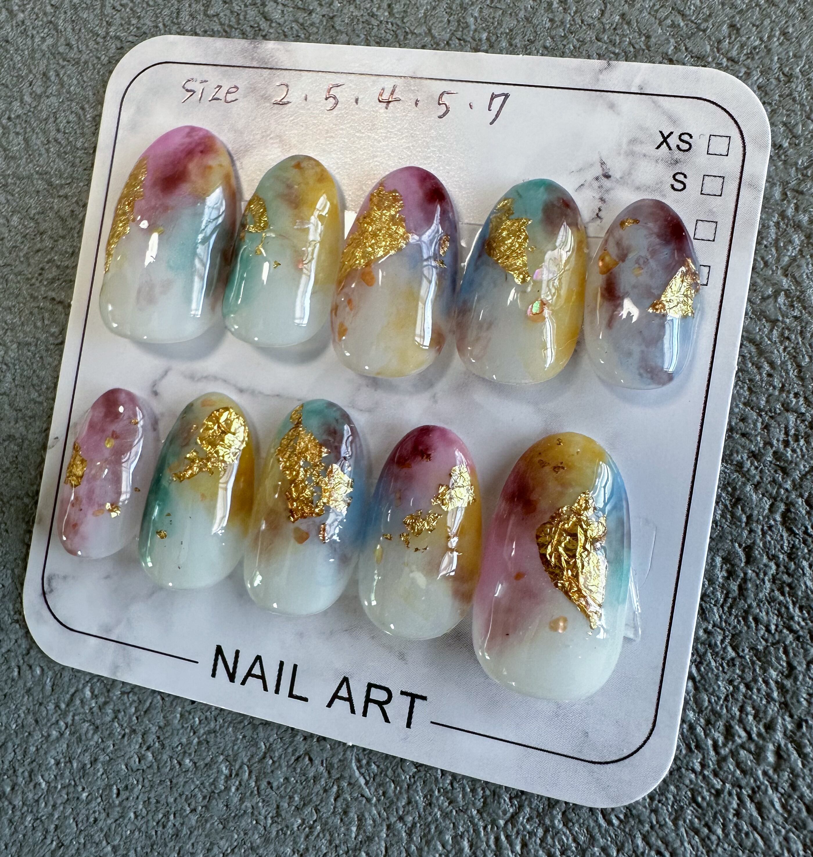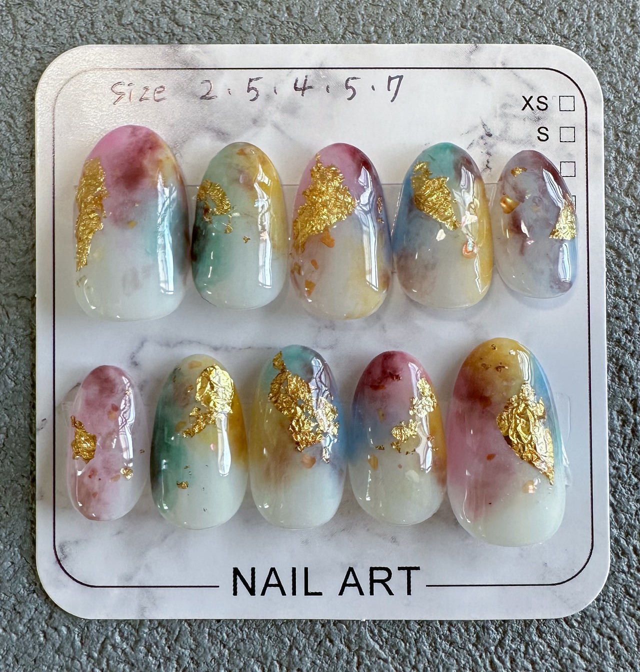 ①[ネイルチップサイズ表]からお爪に合うチップの大きさを測定していただき、S.M.Lサイズ(または特注サイズ)から選択。
